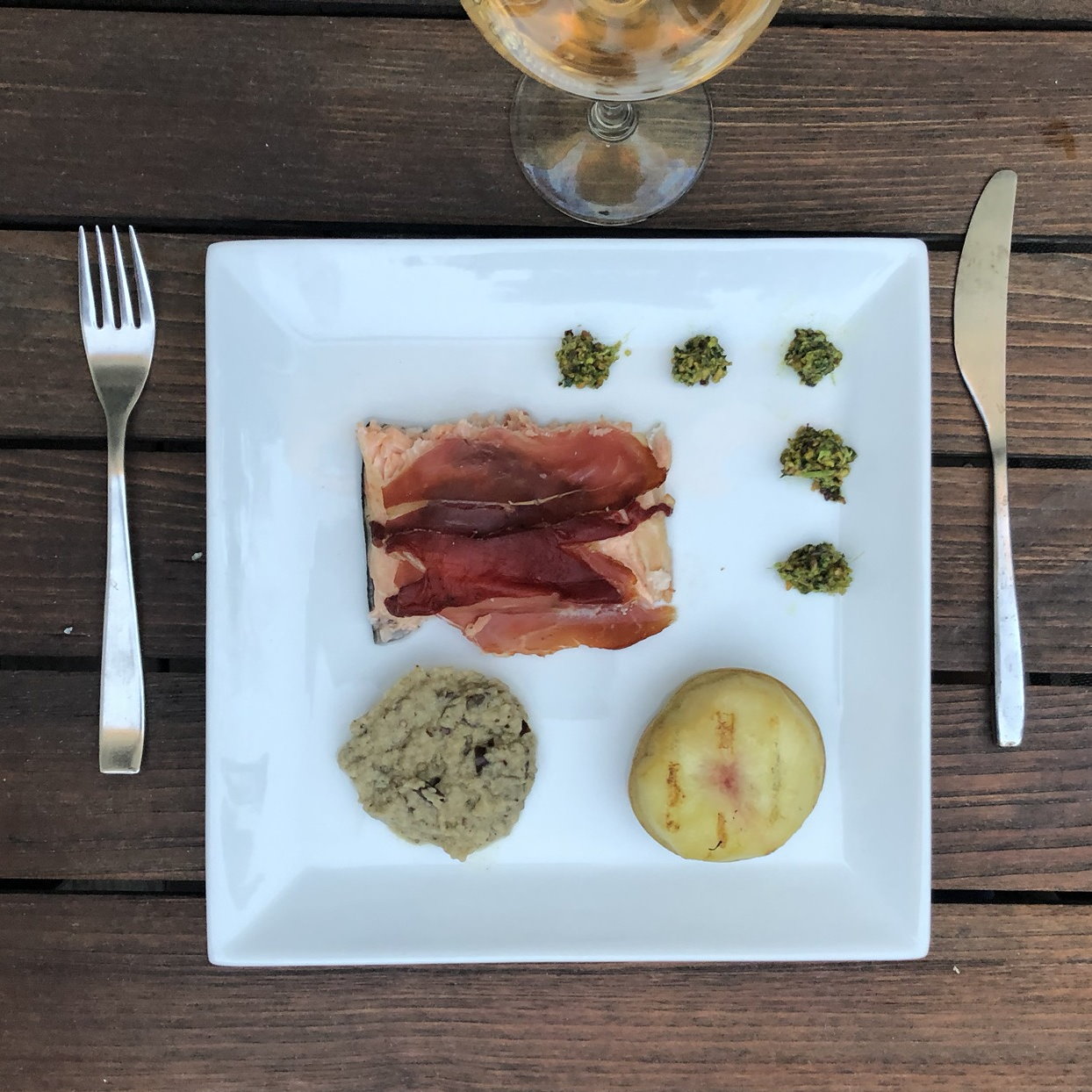 Dress your plates with points of pesto, a circle of caviar, a peach and a slice of trout.